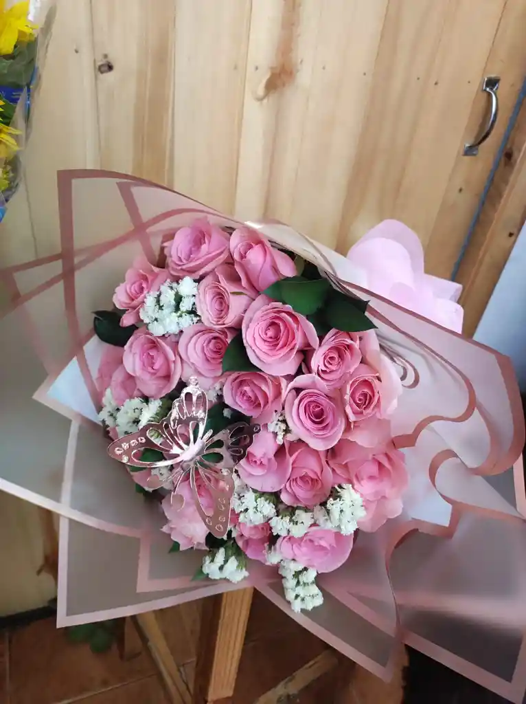 INCLUYE: 24 Rosas Follaje 1 Mariposa Moño decorativo Papel koreano Para escribir un mensaje para la tarjeta déjala en nuestro chat. El color de las flores estan sujetas a la disponibilidad de la tienda, también se pueden personalizar.