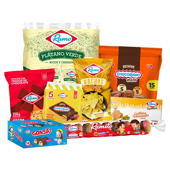 Minichocobrownie X300Gr + Barrita De Chocoramo X5 Und + Ponque Ramo Trozos De Chocolate 230Gr + Nachos Ramo Queso 190Gr + Ramito 25Gr X10 Und + Galletas Artesanales Miel Display X9 Und + Gansito 37Gr X14 Und + Ramo Platano Verde 40Gr X8 Und