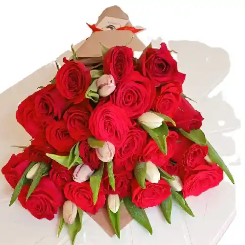 ✨ ¿Qué recibirás en este lujoso y romántico ramo? ✨ El ramo Pasión Pura es una muestra imponente de amor, elegancia y distinción. Compuesto por 15 rosas rojas premium, símbolo de la pasión más profunda, y 12 lirios blancos cerrados, que aportan delicadeza y pureza, este arreglo es perfecto para hacer una declaración poderosa y sofisticada. 🌿 Características del ramo: 15 rosas rojas frescas – expresan amor ardiente, deseo y compromiso. 12 lirios blancos – representan paz, inocencia y elegancia natural. Follaje verde natural – aporta frescura y realce visual al ramo.