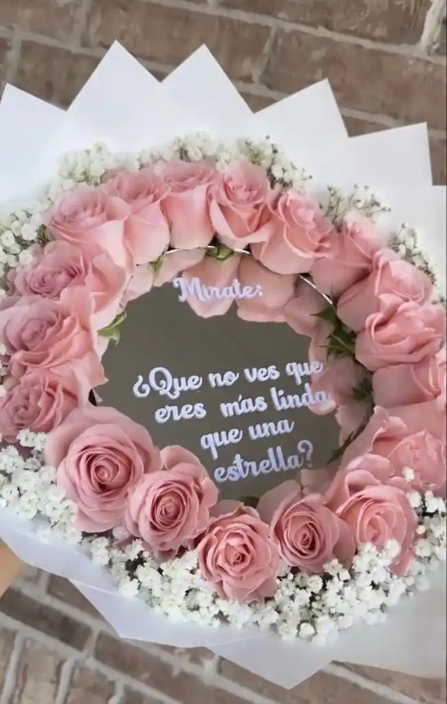Ramo con espejo y 24 rosas aproximadamente y gypso , mensaje