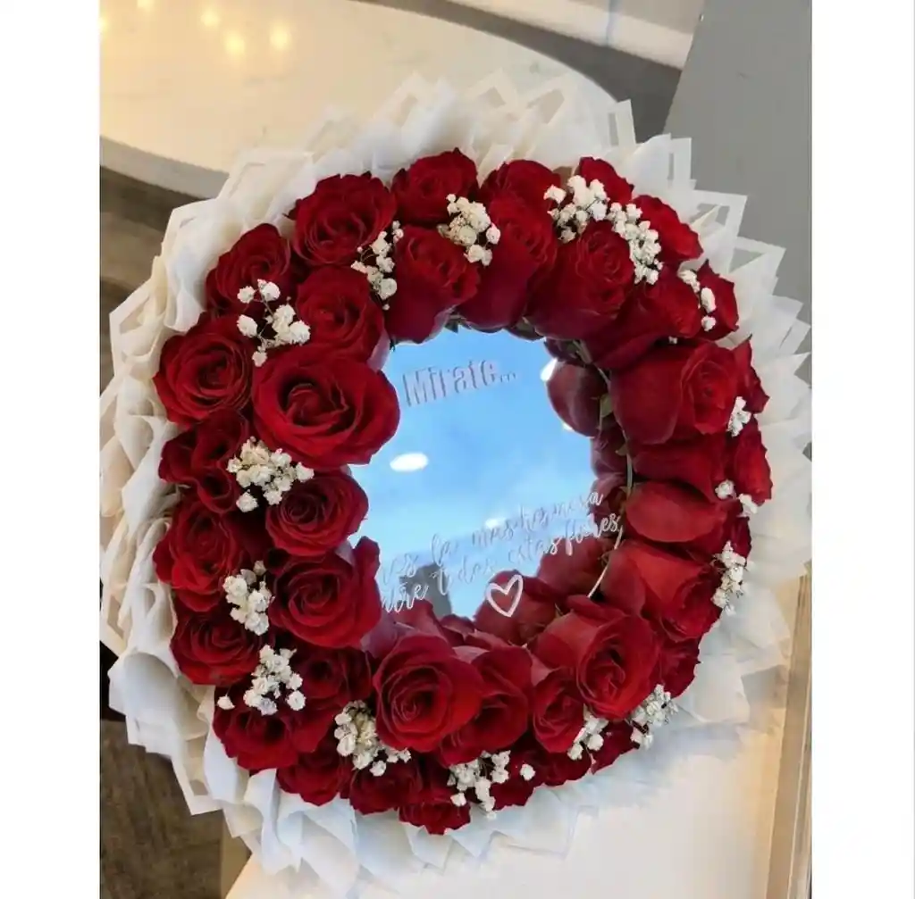 Ramo con espejo y 48 rosas rojas y gypso con mensaje " Mirate, eres la mas hermosa entre las flores