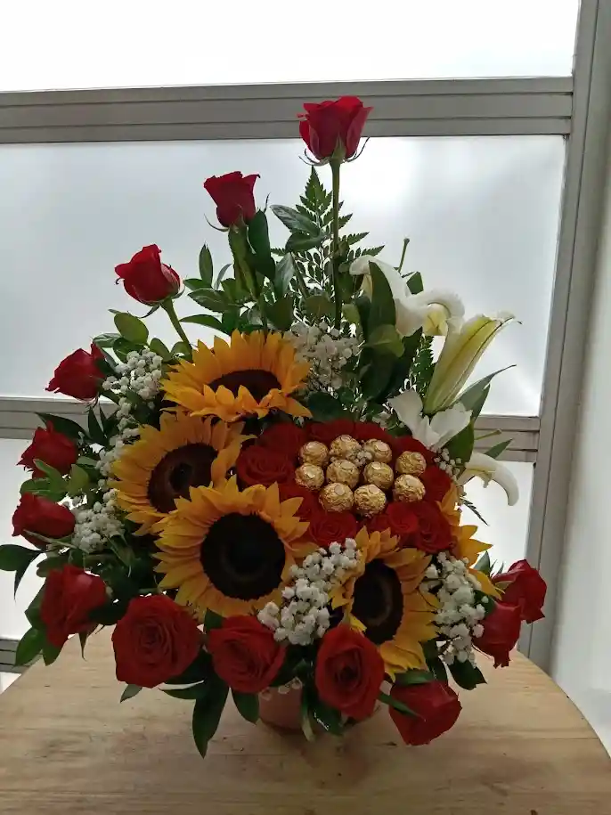 24 rosas con lirios y chocolates ferrero en base de madera o cilindro espuma floral y follaje