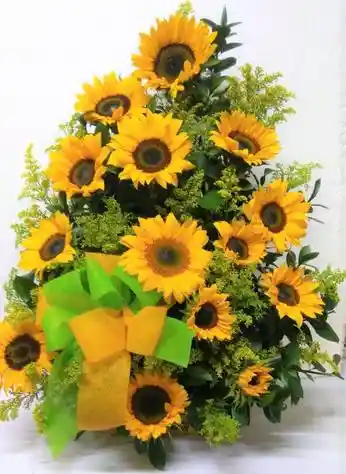 Los girasoles son ideales para obsequiar a una persona en sus grados o cumpleaños. Tamaño aprox. 85 cm. Contiene: 15 Girasoles, Base de madera, solidago., tarjeta y moño. Rusco.