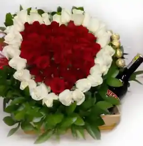 Ramo en forma de corazón. Contiene: 1/2 botella de baileys, 60 rosas, Base de madera, ferrero X8, moño y tarjeta, Rusco