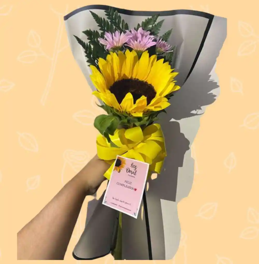 RAMO DE 1 GIRASOL DECORADO CON MARGARITAS O ASTROMELIAS DE COLOR A DISPONIBILIDAD, CON PAPEL COREANO, MOÑO DECORATIVO Y TARJETA PERSONALIZADA.