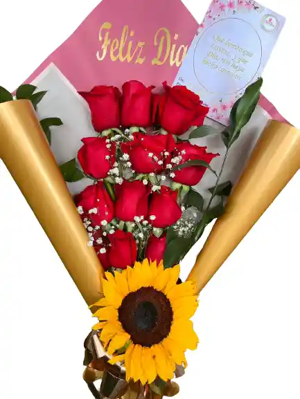 Arreglo floral con 12 rosas rojas y girasol