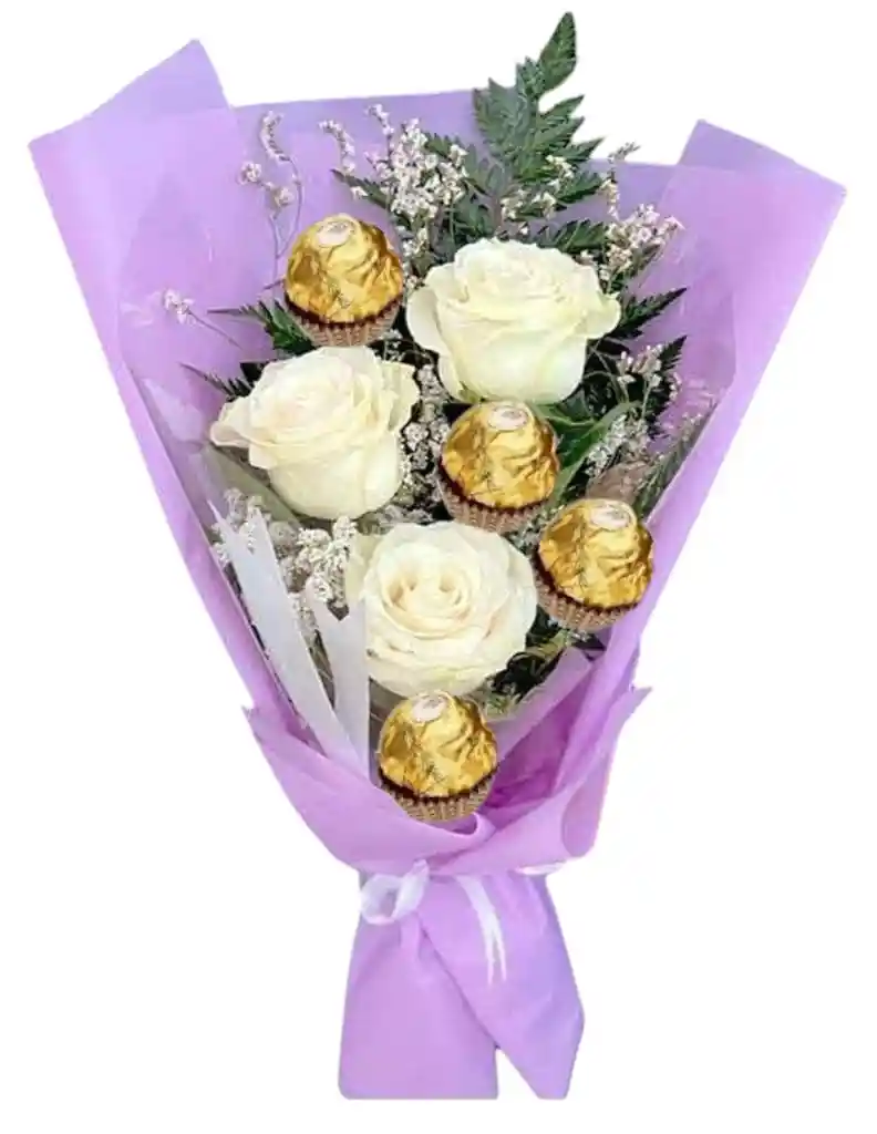 Ramo de 3 rosas blancas y 4 ferrero, con follaje, papel y moño