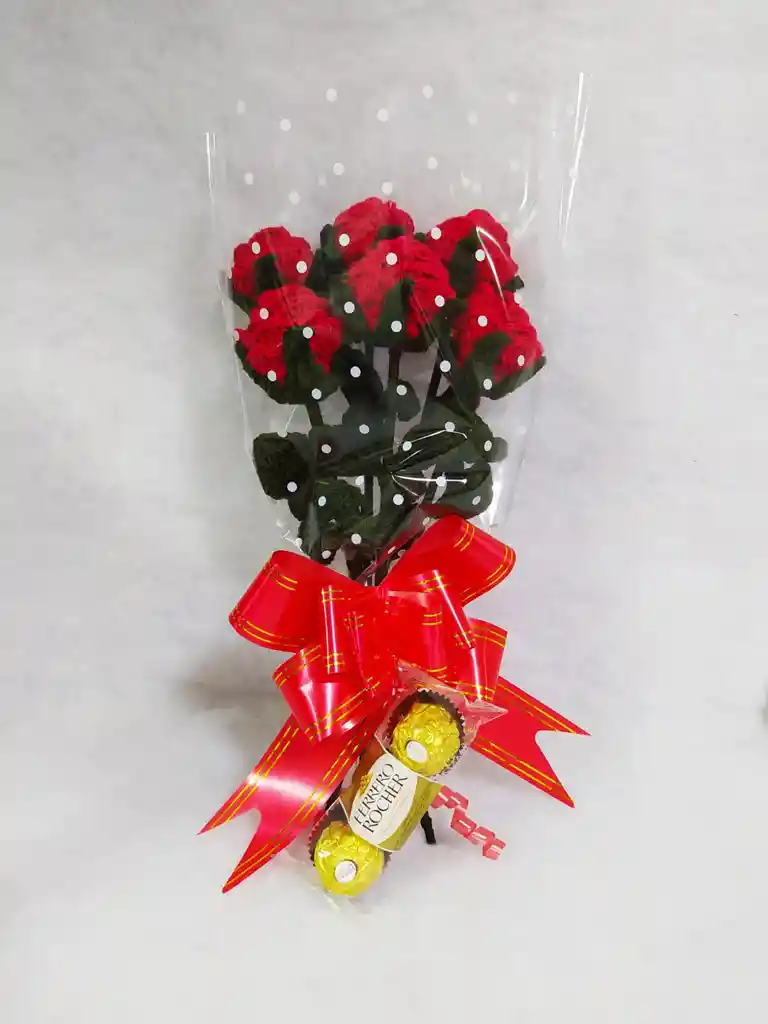 Ramo de 6 Rosas, echas en hilo macramé a mano. Más moño, más Chocolates Ferrero X3