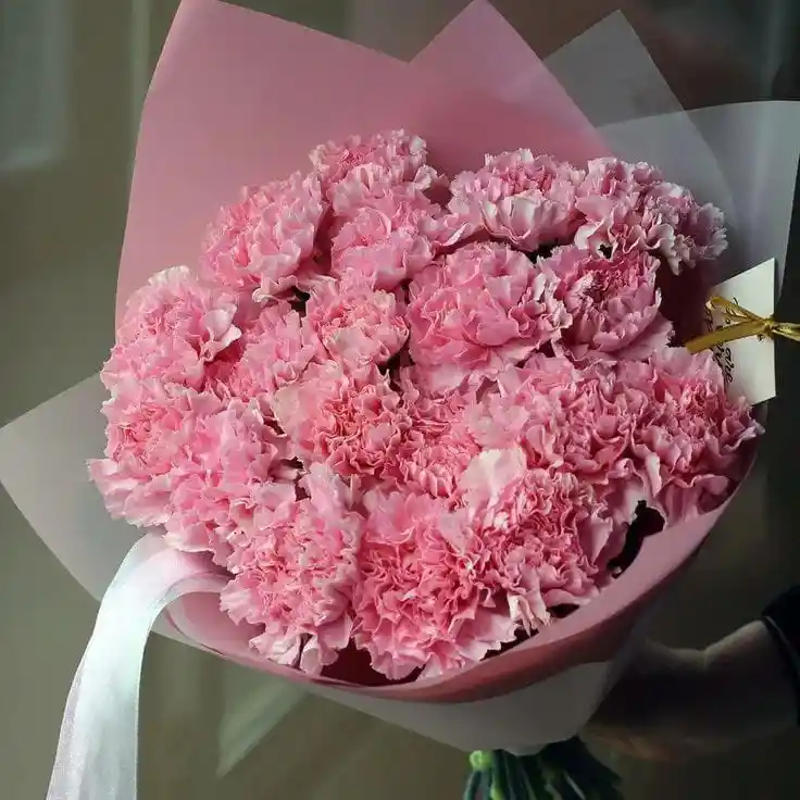 ramo de claveles rosados decorados con tarjeta regalo