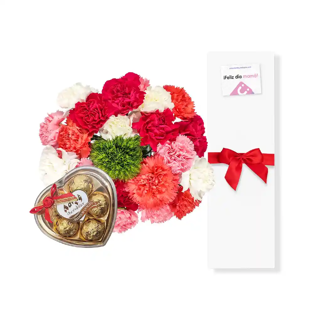 Ramo de flores con 24 unidades de claveles Naturales dentro de una caja de carton reciclado que incluye caja grande de chocolates de 8 unidades