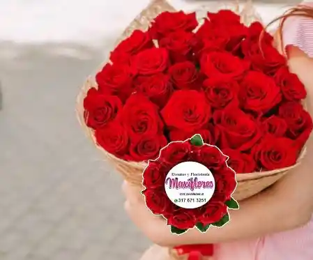 RAMO DE MANO CON 48 ROSAS ROJAS + MOÑO DECORATIVO