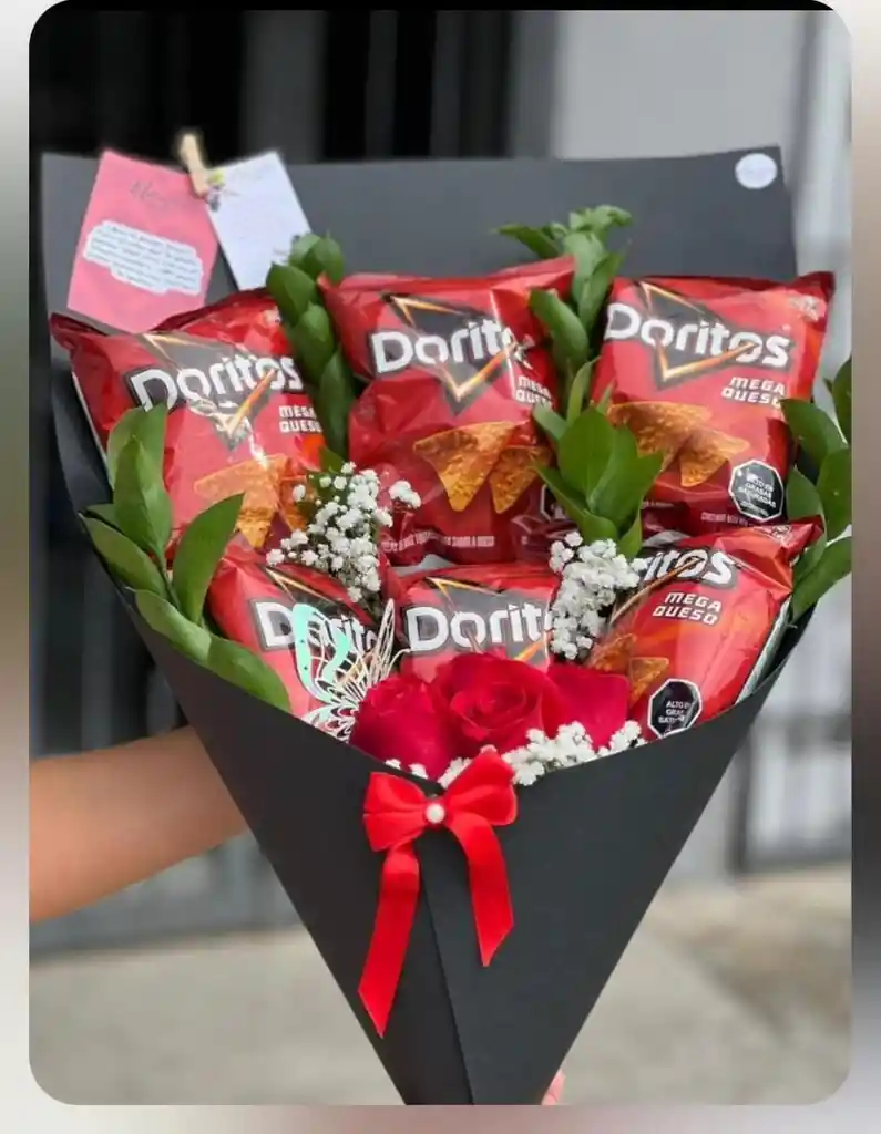 Ramo de Doritos: El regalo perfecto para los amantes de los snacks 🌟 Sorprende con este creativo ramo lleno de sabor y diversión. Ideal para cualquier ocasión, este detalle único incluye: 🔥 Paquetes de Doritos de distintos sabores para deleitar el paladar. 🎀 Decoración especial que lo convierte en un regalo original y memorable. 🍽️ Perfecto para compartir en reuniones, fiestas o simplemente disfrutar solo. 🎁 ¡Haz de los snacks el centro de atención con este ramo único! Personaliza los sabores y sorprende a ese fanático de Doritos que tienes en mente.