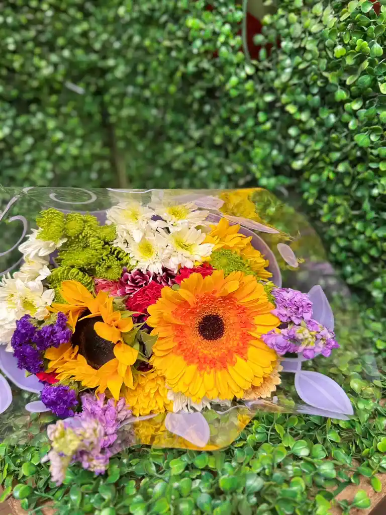 Dale color y alegría a cualquier momento con nuestros hermosos ramos artesanales, elaborados con flores 100% frescas y seleccionadas. Cada arreglo combina girasoles, gerberas, margaritas y crisantemos en tonos vibrantes de amarillo, rosa, blanco y morado, creando una presentación elegante y alegre.