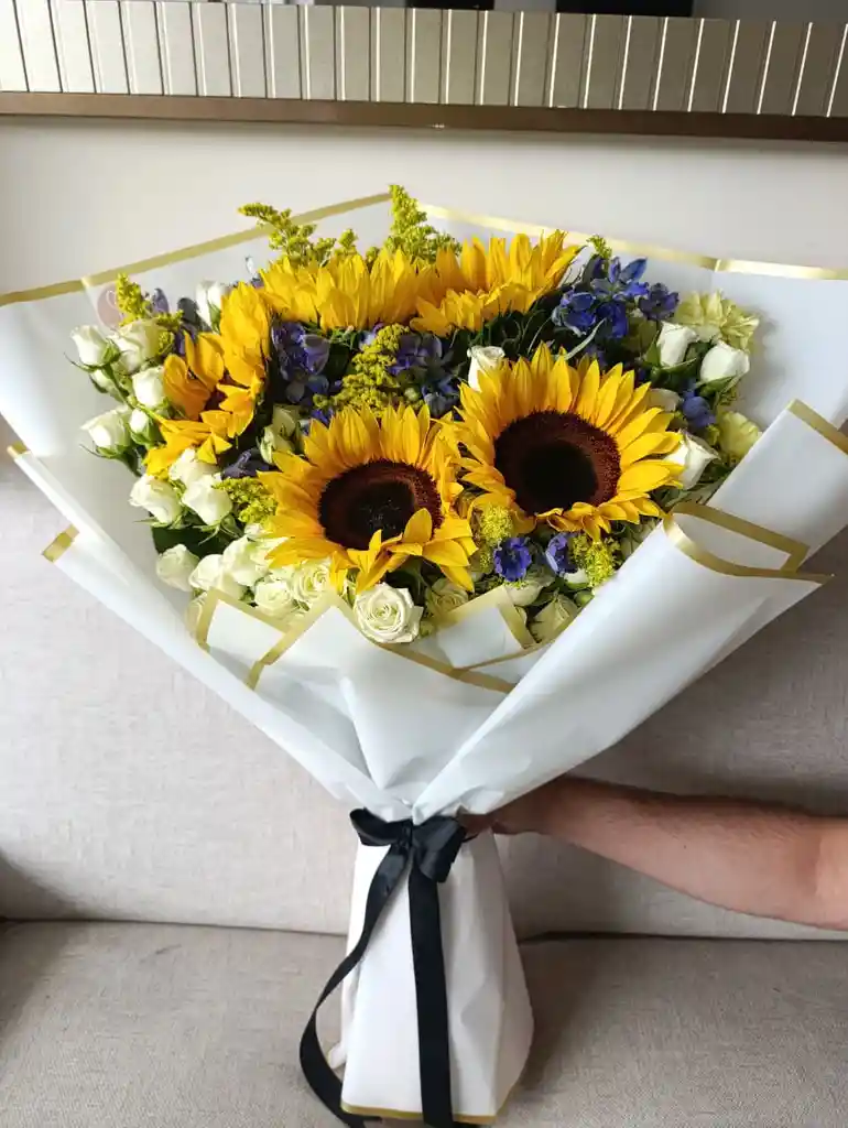 💛 Bouquet Amarillo Sol en forma de flores. Este bouquet vibrante reúne 5 girasoles con mini rosas amarillas y un mix de flores como agapantos y follaje silver, creando una composición luminosa y enérgica que irradia alegría, gratitud y vitalidad. Ideal para levantar el ánimo, celebrar un logro o simplemente decir: “¡Que tengas un gran día!” 💌 Incluye tarjeta de dedicatoria personalizada. 🌱 Imagen referencial: Utilizamos flores naturales morfológicamente únicas. 📍 Disponible para entrega en Bogotá, La Campiña. 💳 Métodos de pago: Tarjeta de crédito, débito o transferencia bancaria inmediata, PSE.