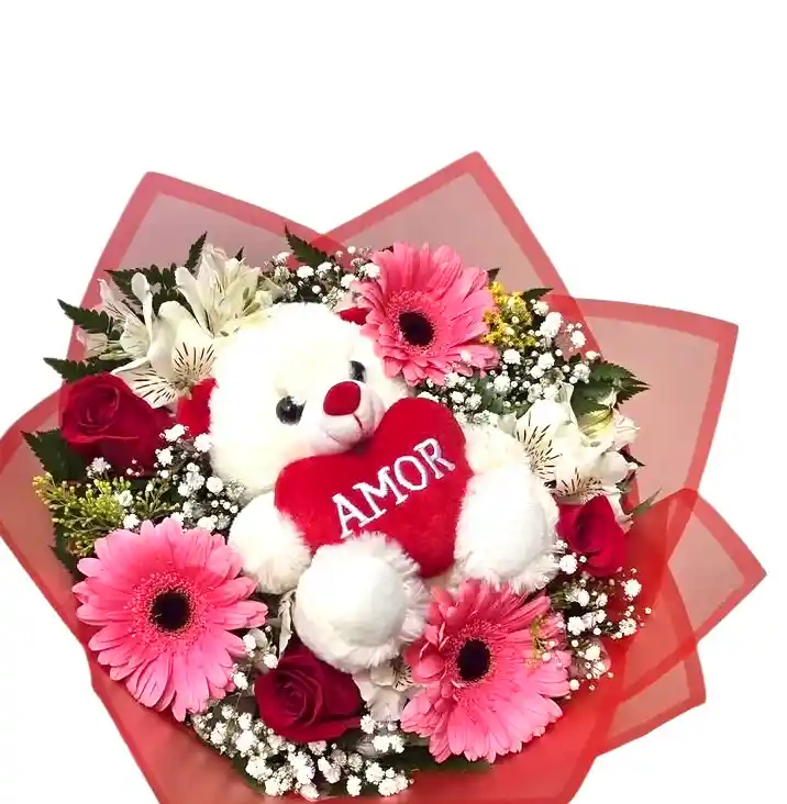 contiene 1 peluche pequeño 3 gerberas 3 rosas rojas azucenas follaje amarillo gizpohilia follaje verde decoración tarjeta personalizada