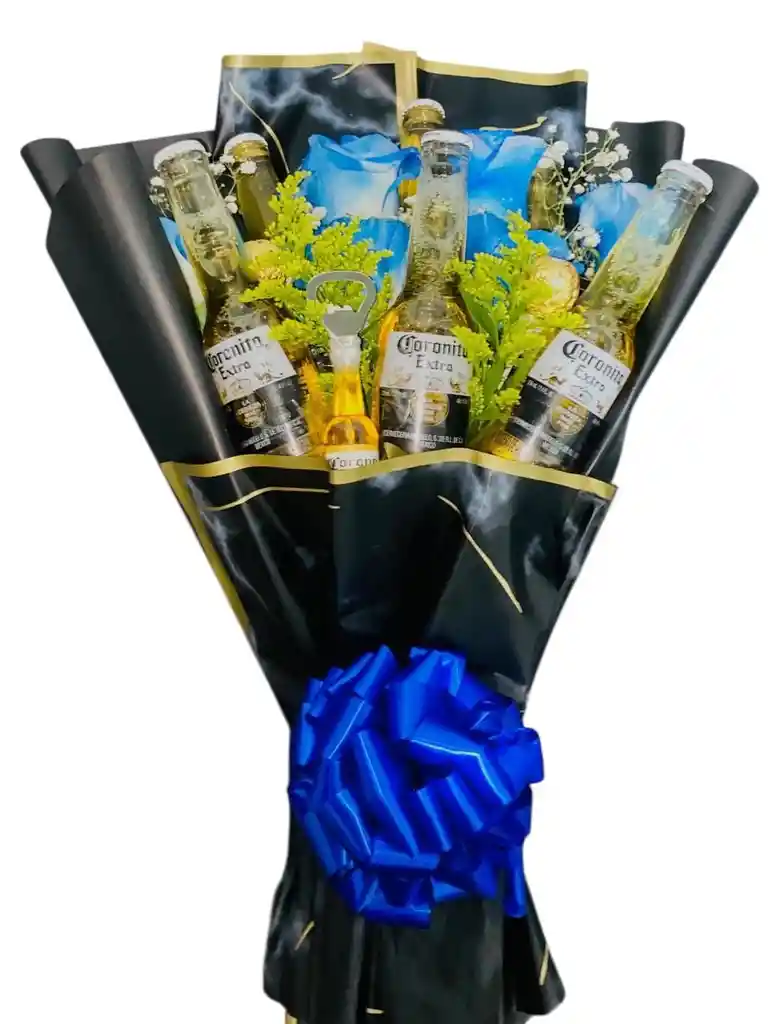 contiene 6 cervezas coronitas 1 destapador de coronita 2 bolas de chocolates 6 rosas azules decoración tarjeta personalizada arreglo de cervezas y rosas azules arreglo floral rosas azules engalanado de rosas buquet de rosas feliz cumpleaños para hombre feliz día para mujer para cualquier ocasión
