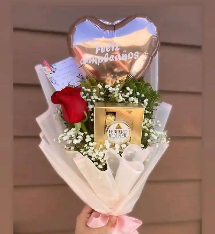 CONTIENE Rosa con follaje, chocolates ferrero, globo y tarjeta personalizada ETIQUETAS DE BUSQUEDA Regalo para mujer Regalo para mi novia regalo de cumpleaños Arreglo floral para mi novia Arreglo floral para mi esposa ramo de flores Bouquet de flores Flores para mi amiga