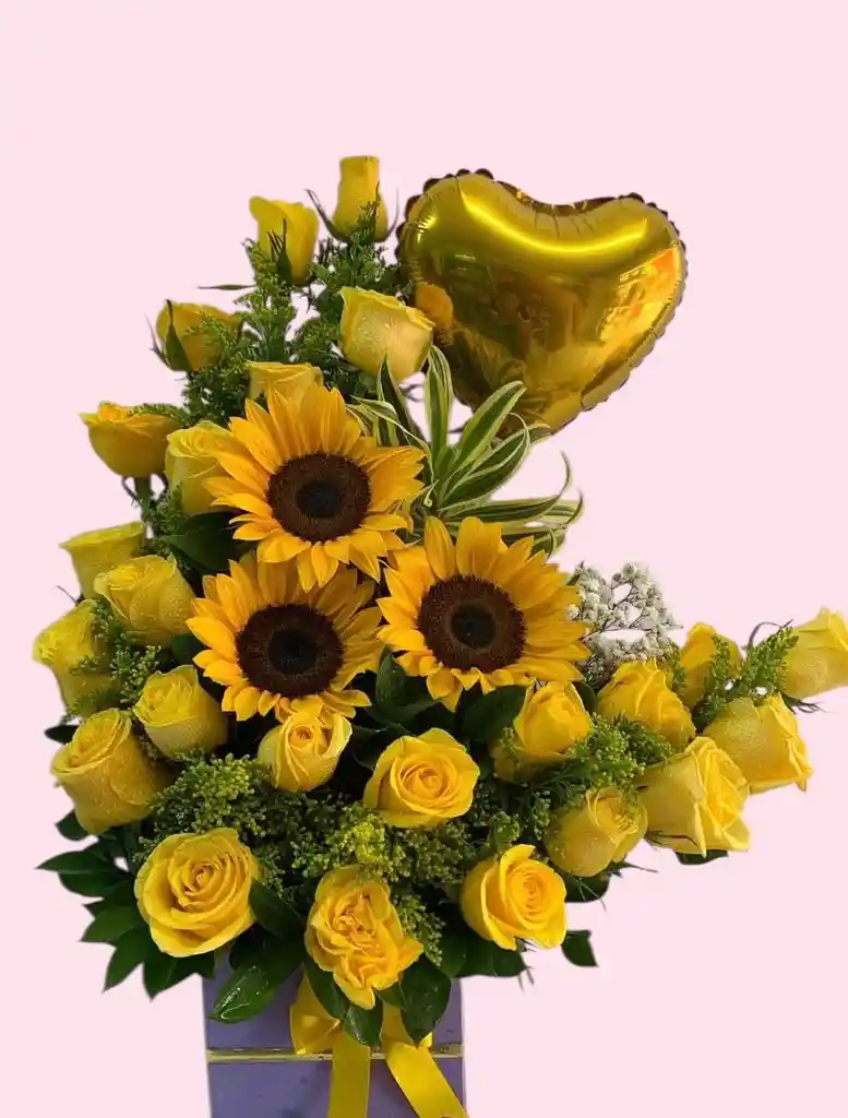 Contiene 24 rosas amarillas 3 girasoles Follaje Globo