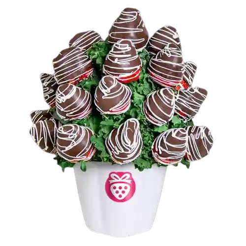 Deliciosas Fresas Con el Más Exquisito Chocolate y Decorativas Líneas. ¡Sorprende Con un Obsequio Único y Original! Obsequia Arreglos Frutales Con Decofruta.