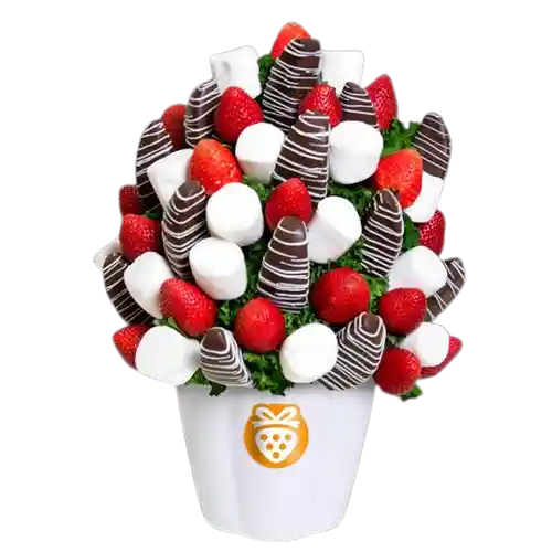 Ramo Frutal Con Deliciosas Fresas Marshmallow Manzanas Con Chocolate y Líneas de Chocolate Blanco. ¡Sorprende Con un Obsequio Único y Original! Mejores Regalos Que Las Rosas o Los Arreglos de Flores Obsequia Arreglos Frutales Con Decofruta.