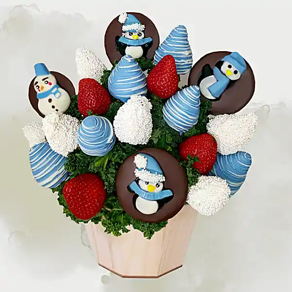 Ramo Frutal Nieve Fresas con chocolate azul Fresas con grageas comestibles Fresas naturales Manzana con chocolate Apliques: Pingüinos navideños de chocolate