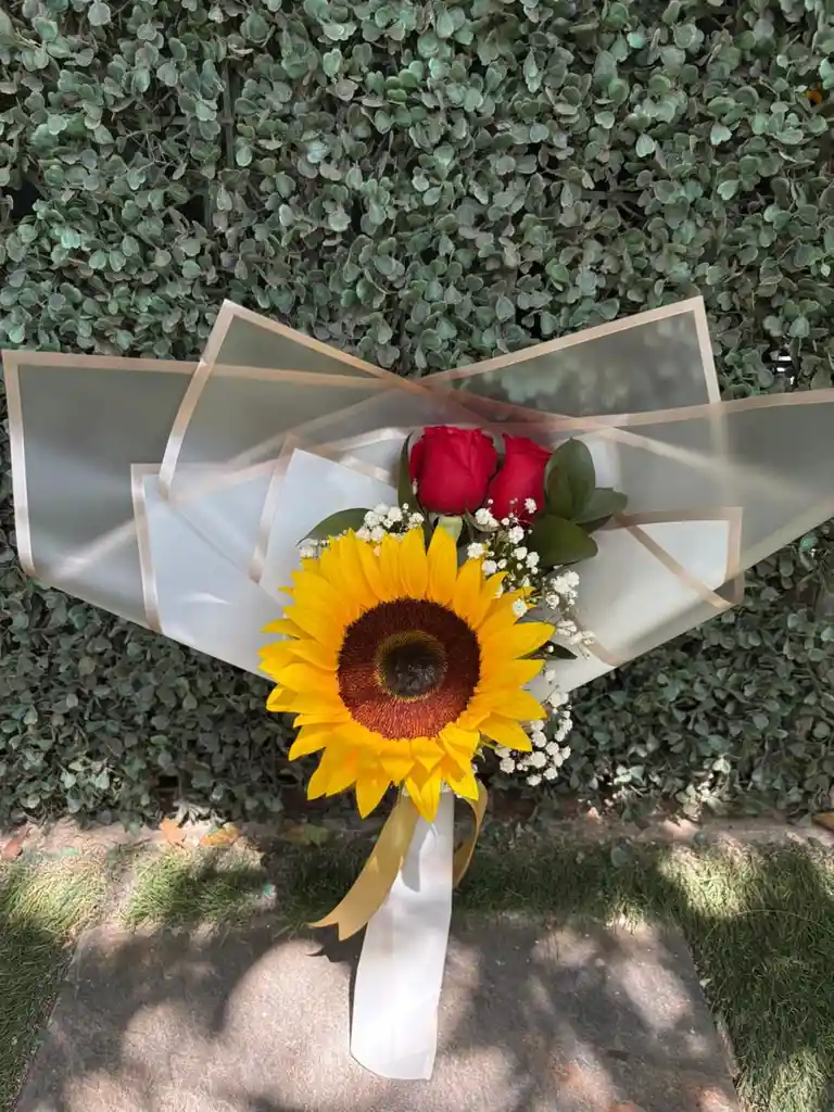 Ramo de girasol con rosas rojas