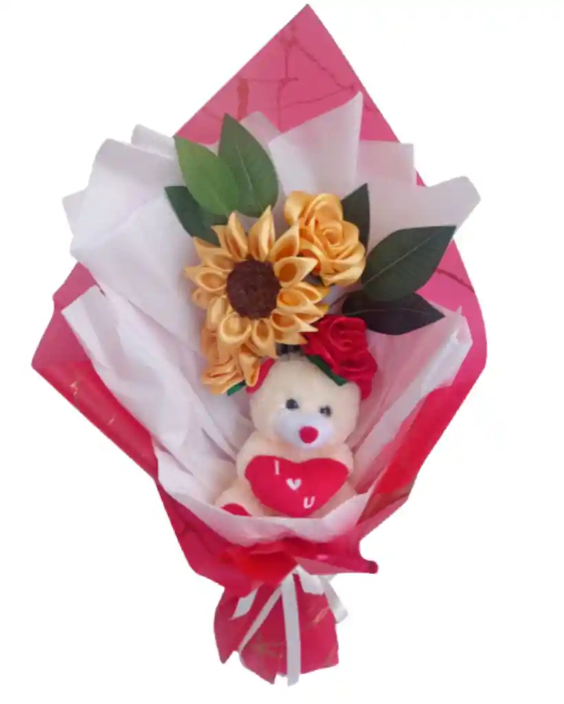 hermoso ramo de girasol eterno en color amarillo y rosas con un lindo peluche, un hermoso bouquet que representa la alegria , ideal para celebrar aniversarios o para expresar cariño incluye tu mensaje personal y globos sencillos