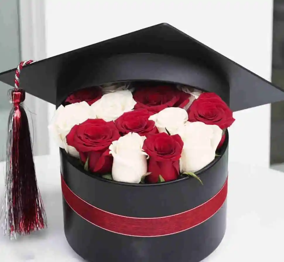 arreglo floral en caja redonda con 12 rosas blancas y rojas