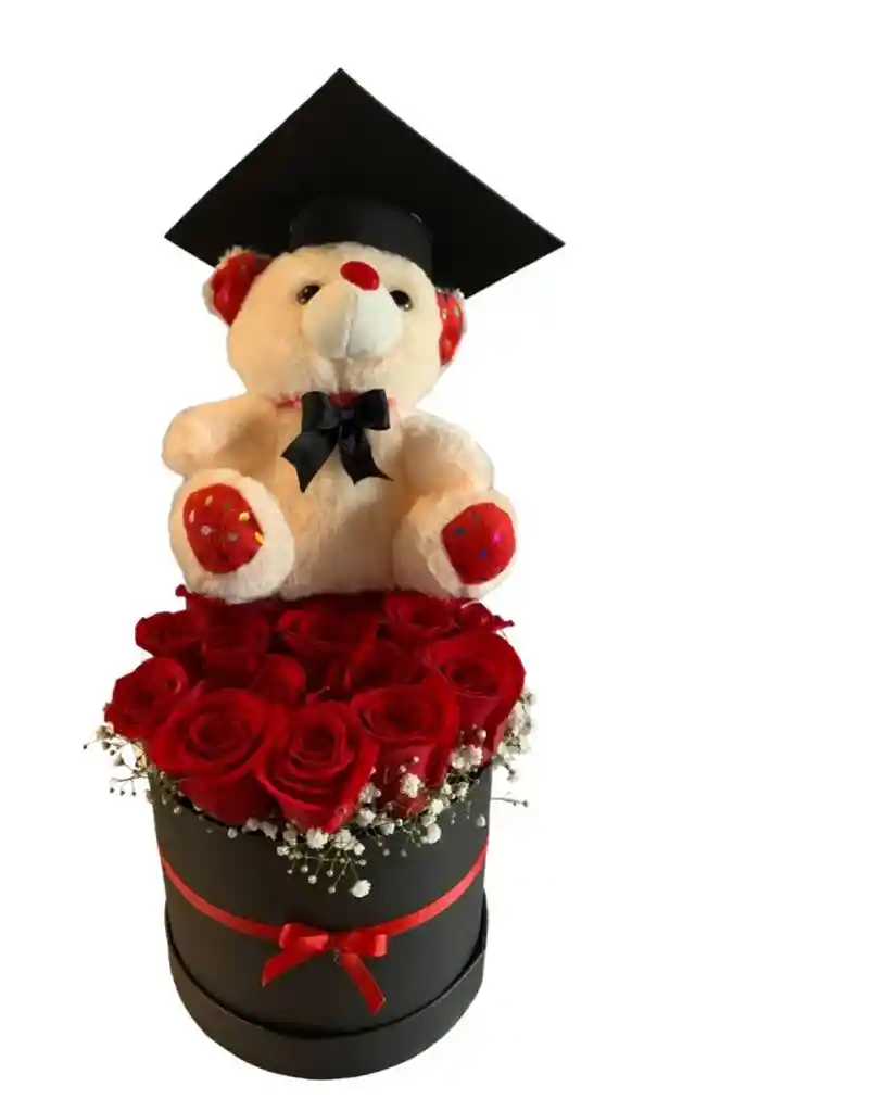 arreglo floral con 15 rosas en caja redonda, con peluche a su gusto con toga y birrete.