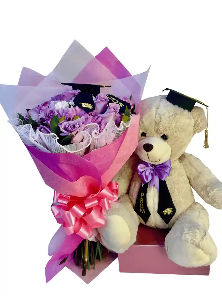 Celebra su grado con un ramo especial que incluye flores frescas y un peluche tierno. Un detalle perfecto para sorprender, felicitar y crear un momento inolvidable