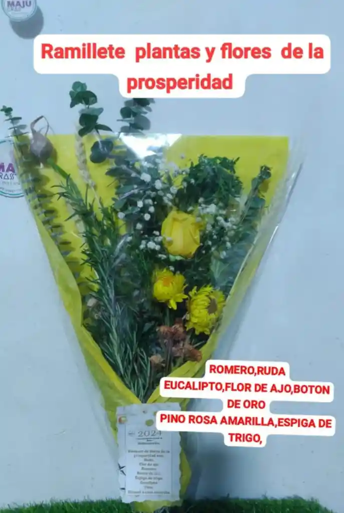 ramillete de la prosperidad ideal para todo el año y dar buena energia al hogar con : boton de oro ruda romero eucalipto flor de ajo espiga de trigo pino rosa o girasol para decoración