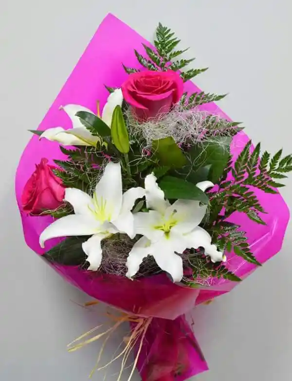 ramo de lirios x3 unidades color blanco , con rosa roja y follaje verde ,este especial detalle incluye mensaje personalizado