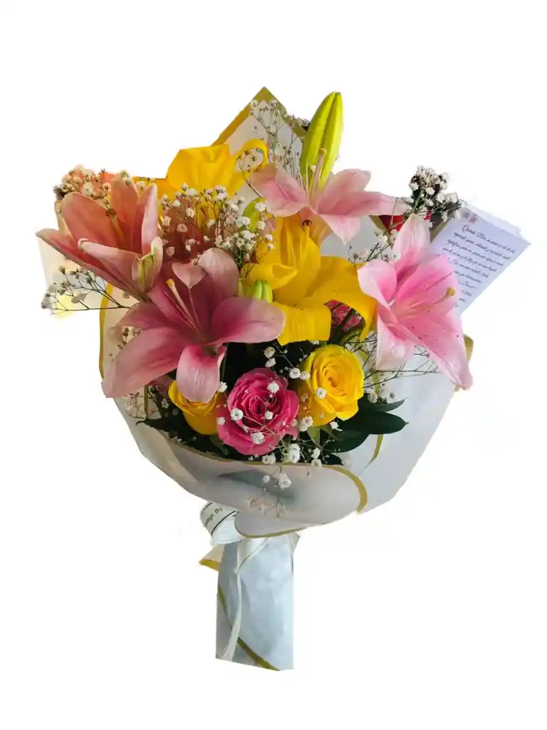 Ramo pequeñp con lirios y rosas en dos tonos con papel decorativo con moño y tarjeta personalizada si el cliente lo desea. *El color del Lirio y de la Rosa puede variar según disponibilidad