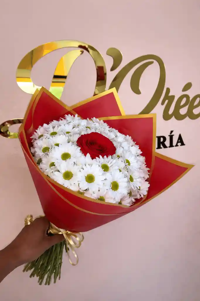 Bouquet elegante con margaritas blancas frescas y una rosa roja central que resalta su belleza. Envuelto en papel premium para una presentación delicada y especial (el empaque puede variar según disponibilidad de papel coreano). Ideal para sorprender en cumpleaños, aniversarios, fechas especiales o simplemente alegrar el día de alguien. Incluye tarjeta con mensaje personalizado.