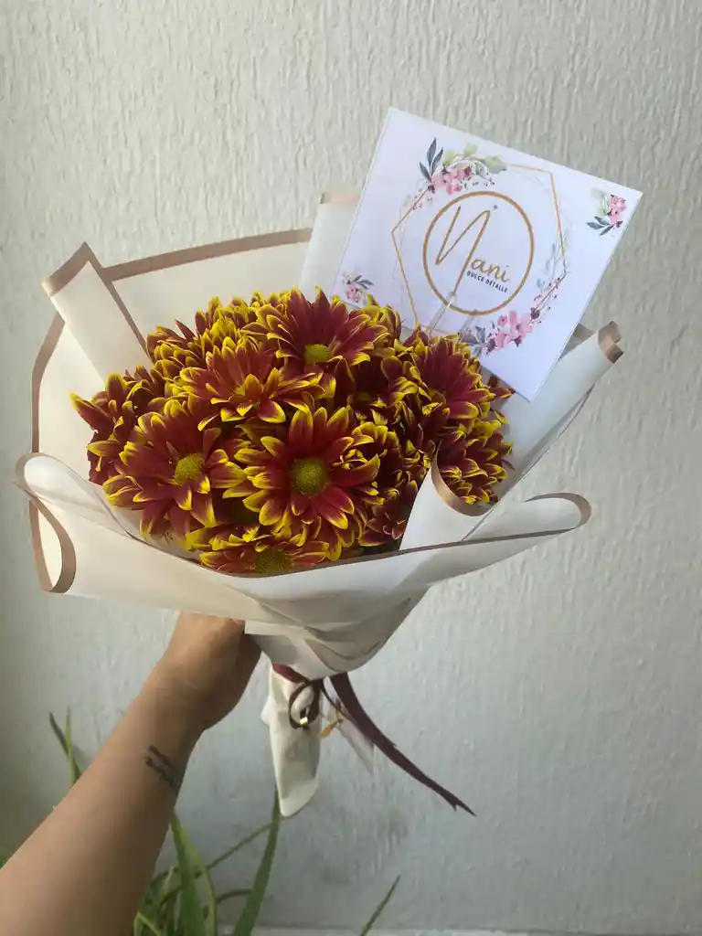 Ramo de margaritas colores oscuros ( colores disponibles por la tienda) si tenemos el colores a su preferencia disponible lo haremos a su gusto, de lo contrario procedemos a realizarlo con los colores disponibles.