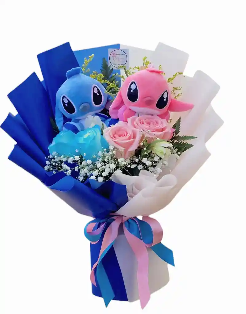 Contiene 1 stich azul 1 stich rosado 2 Rosas rosadas 2 Rosas azules Follaje verde Follaje amarillo Decoración Regalo de cumpleaños Regalo de San Valentín Regalo feliz día