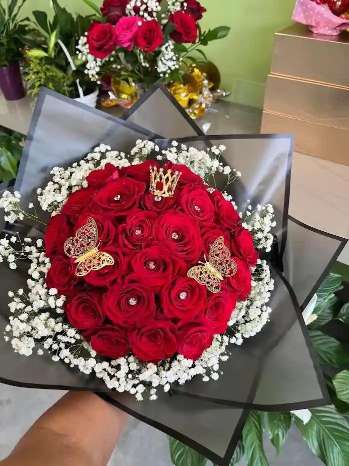Ramo de 24 rosas con corona, mariposas y decoración.
