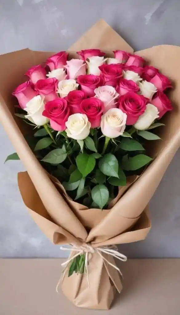 Imponente ramo de rosas en tonos fucsia y blanco, envuelto en papel kraft natural y lazo de yute. Su contraste de colores transmite delicadeza, amor y sofisticación, convirtiéndolo en el detalle perfecto para expresar sentimientos de cariño y admiración.