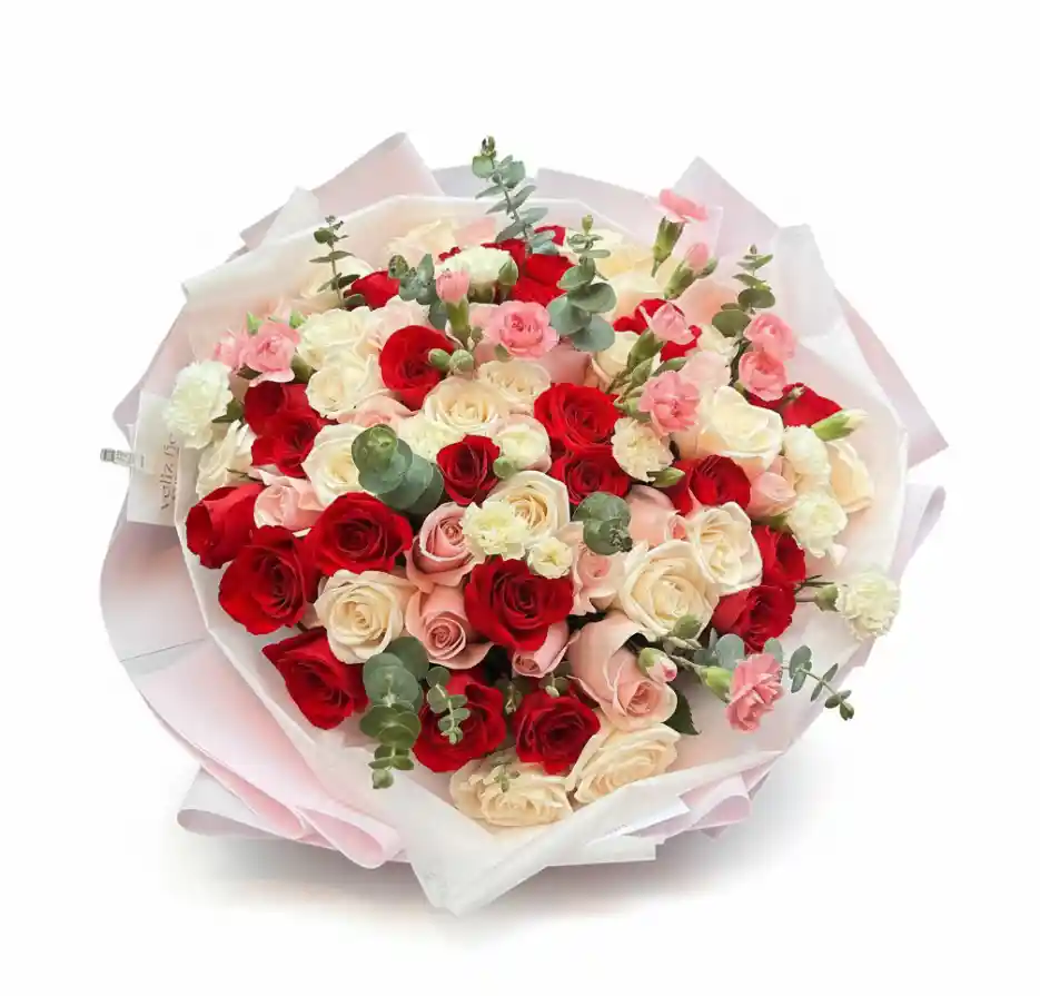 Ramo elaborado con rosas naturales en tonos rojo, crema y rosa, acompañado de follaje de eucalipto y flores complementarias claras. Presentación en envoltura decorativa blanca y rosa, con acabado limpio y elegante.