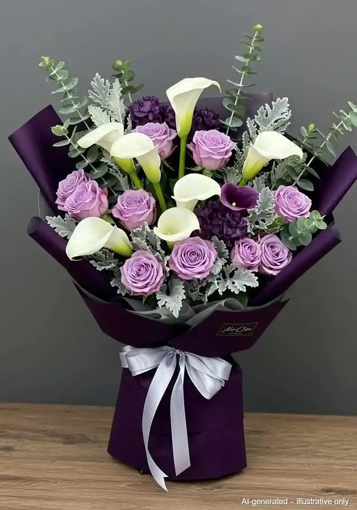 Un detalle diferente y lleno de elegancia. Sorprende con un hermoso ramo de rosas moradas, símbolo de admiración, encanto y amor especial. Perfecto para regalar a esa persona única que merece un detalle inolvidable.