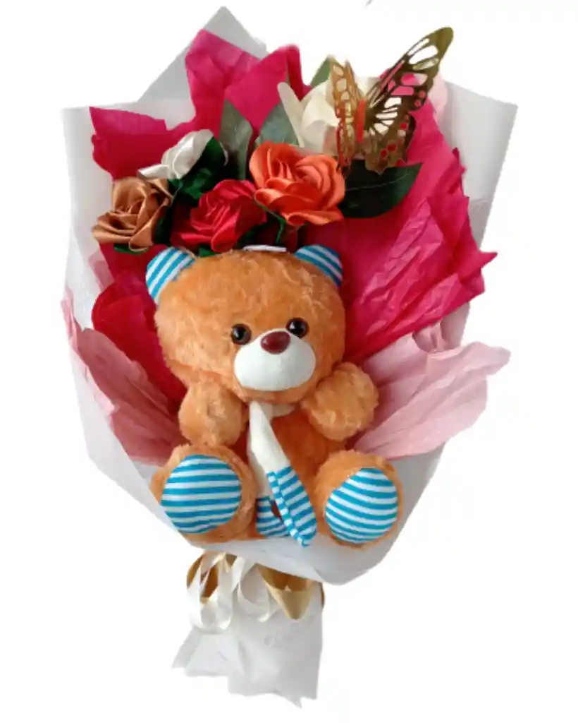 Sorprende a esa persona especial con nuestro Ramo con oso de peluche y flores, un detalle que combina la ternura de un osito adorable con la elegancia y belleza de flores seleccionadas cuidadosamente. Ideal para aniversarios, cumpleaños o cualquier ocasión para expresar amor y cariño con un toque dulce y elegante. Un regalo que alegrará el corazón y transmitirá emociones en cada abrazo y pétalo.