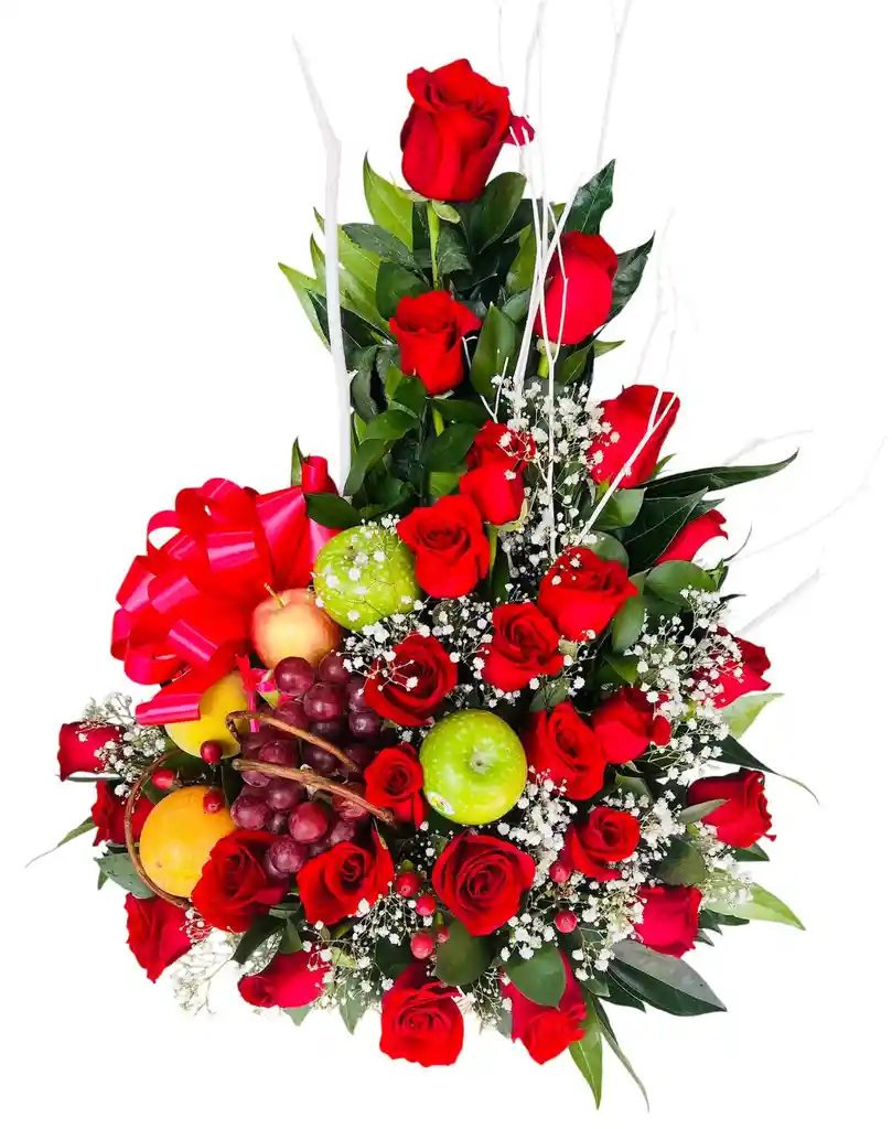 Arreglo floral x24 rosas tipo exportación en tonalidad rojo Follaje fino gipsófilia, rusco Fruta ( 2 manzanas verde, 1 manzanas rojas, 1 duraznos, 1 granadillas, racimo de uvas) Moño en satín rojo Diseño elaborado en base de corteza de madera 15x15 🚨IMPORTANTE: Solicitar diseño con 2-3 horas de antelación por proceso de elaboración.