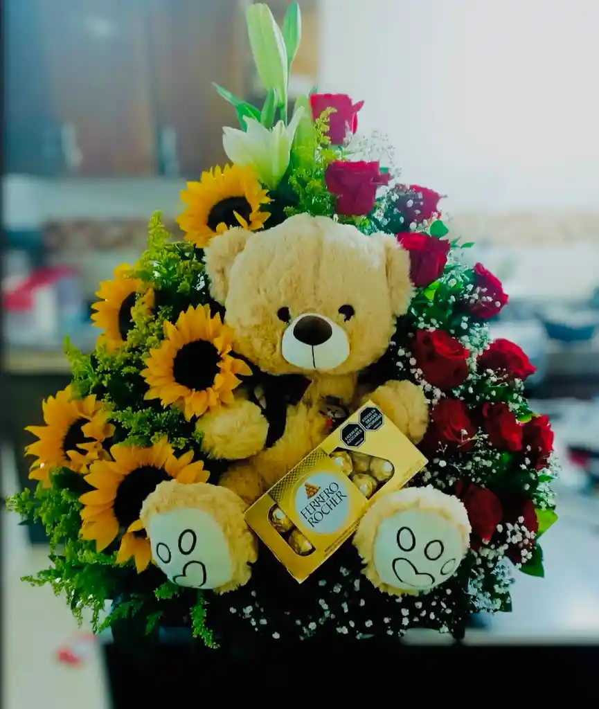 Contiene 5 girasoles 14 rosas de Rojas lirios follaje, amarillo Follaje blanco Follaje verde peluche Chocolate x 8 Decoración Tarjeta personalizada