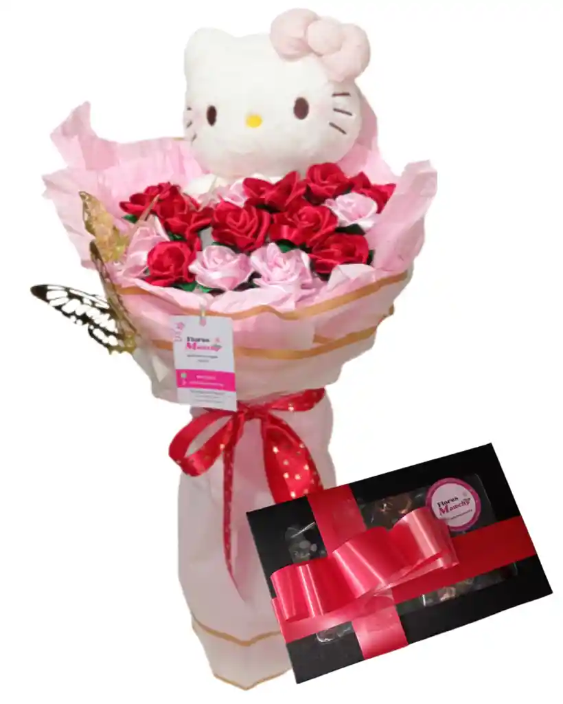 Sorprende a esa persona especial con nuestro Ramo de flores con peluche Hello Kitty, un regalo lleno de ternura y color que encantará en el corazon. Este arreglo combina flores eternas cuidadosamente seleccionadas con un adorable peluche de Hello Kitty, creando un detalle único para cumpleaños, aniversarios o simplemente para expresar tu cariño. ¡Haz que sus momentos sean inolvidables con este regalo que une belleza y dulzura!