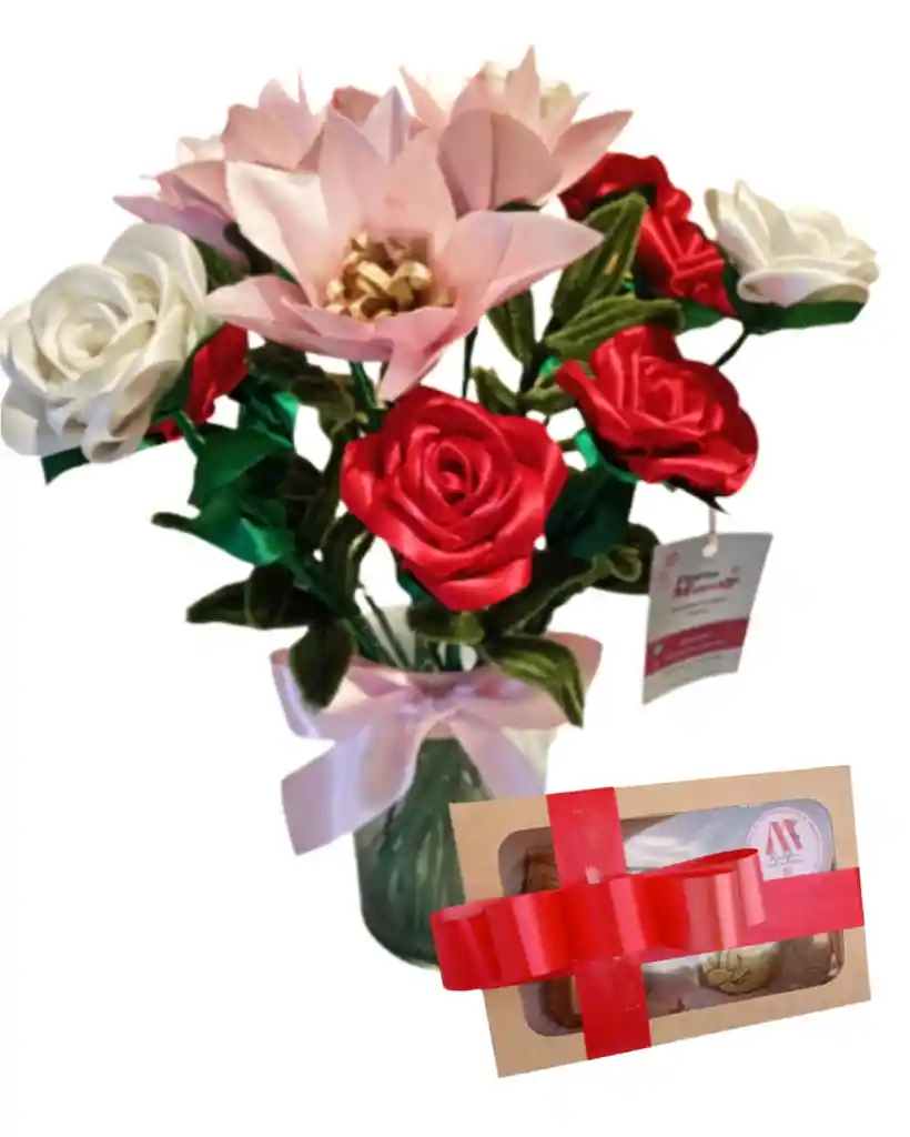 arreglo de rosas, rojas y rosas eternas con una caja de chocolates 24k un regalo lleno de amor y elegancia para celebrar a esa persona especial incluye tu mendaje personal y globos segun la ocasion