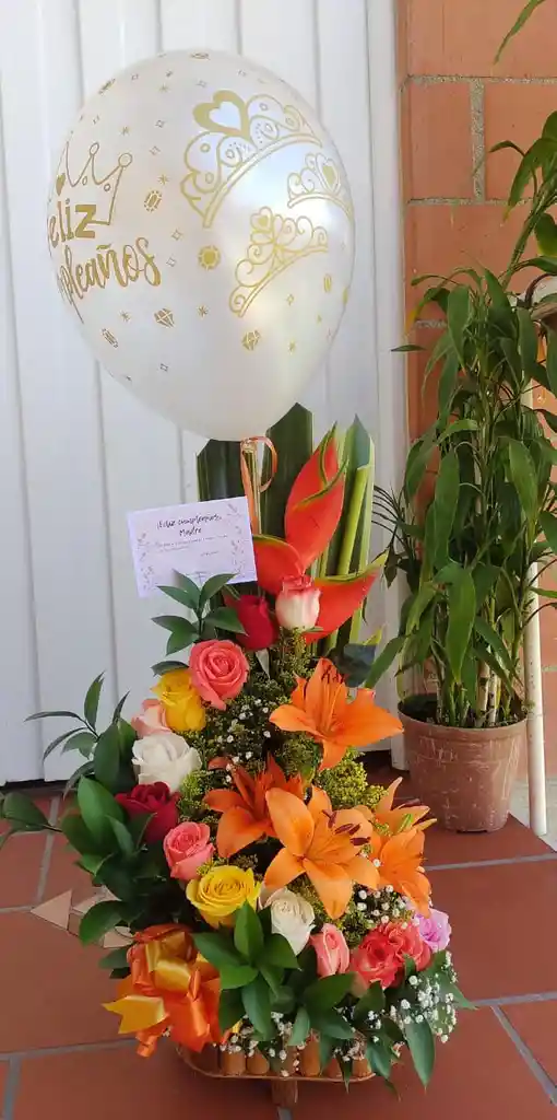 hermoso arreglo de rosas y lirios en variados colores según disponibilidad de la tienda ,con globo en helio