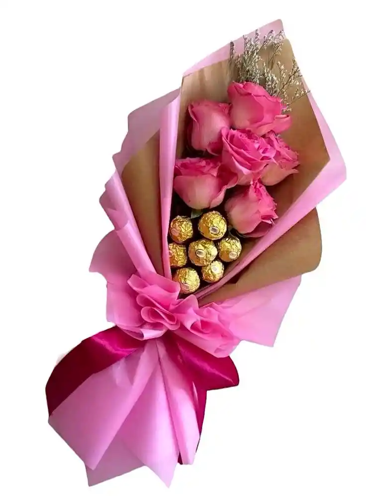 Ramo floral con 6 unidades de rosas rosadas en papel coreano y chocolates Ferrero Rocher