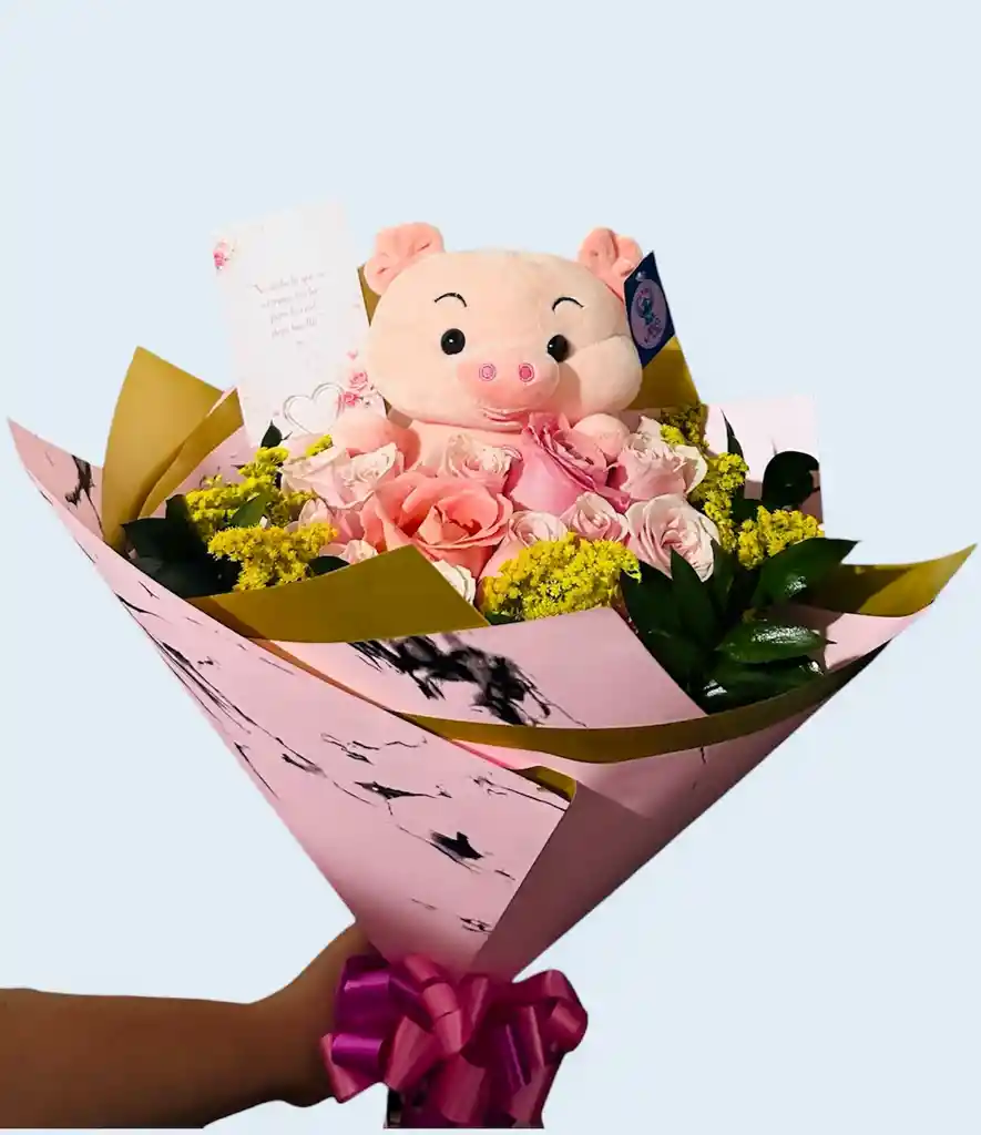 Contiene 1 peluche maranita 18 rosas rosada Follaje amarillo Follaje verde Decoración