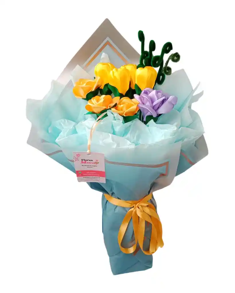 ramo de tulipanes y rosas eternas en color amarillo para celebrar la primavera , con arreglo hermoso y elegante incluye tu mensaje personal y globos segun la ocasion