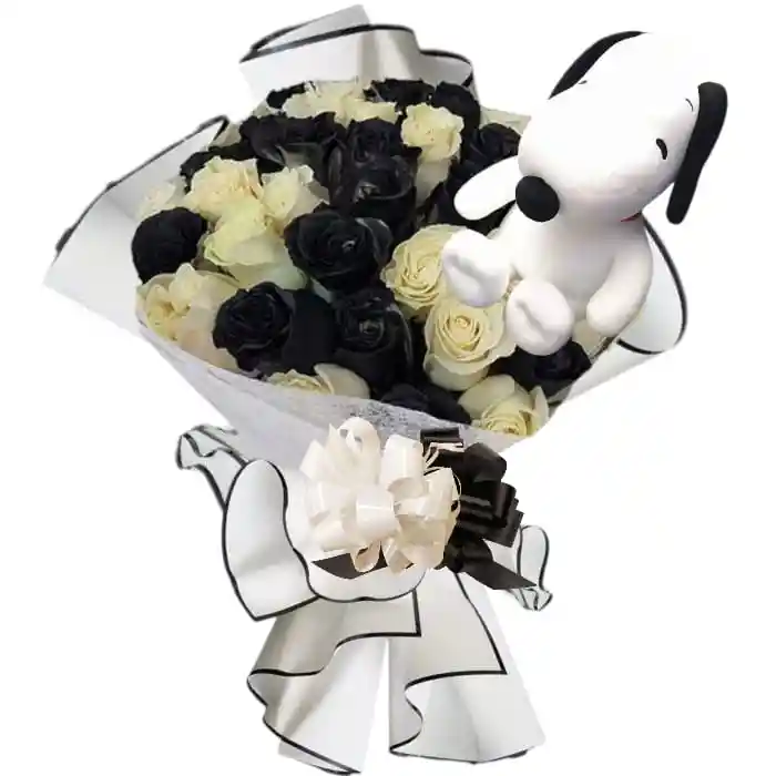 RAMO CON PELUCHE Y DEORACION 12 ROSAS PINTADAS DE NEGRO 15 ROSAS BLANCAS MAS SNOOPY